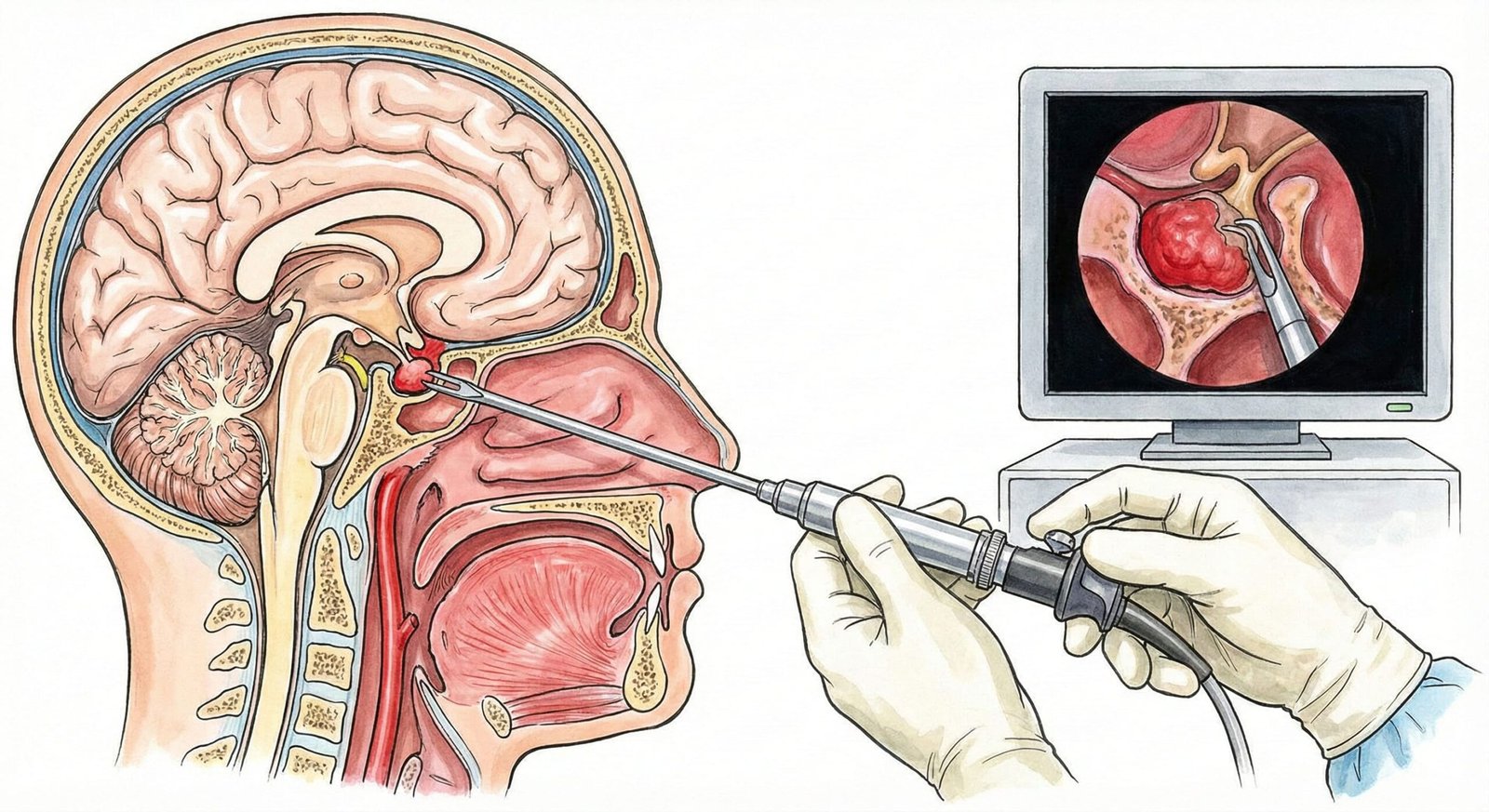 Para tumores grandes que amenazan la vista, la primera opción suele ser quirúrgica. Afortunadamente, ya no abrimos el cráneo para esto. Utilizamos una técnica llamada Cirugía Transesfenoidal, donde accedemos a la glándula a través de la nariz.